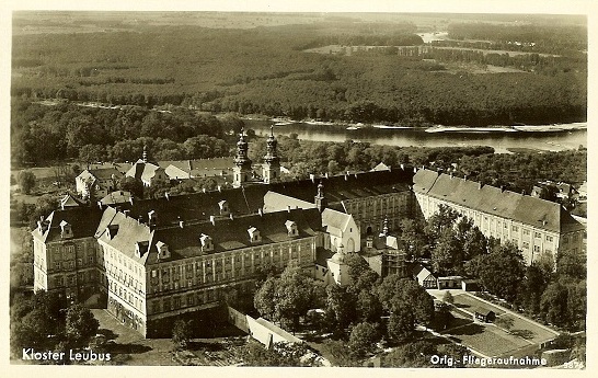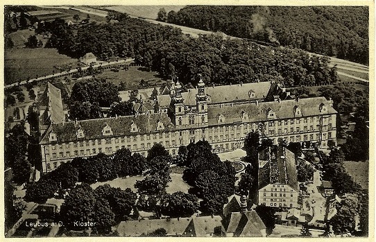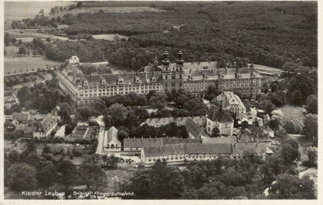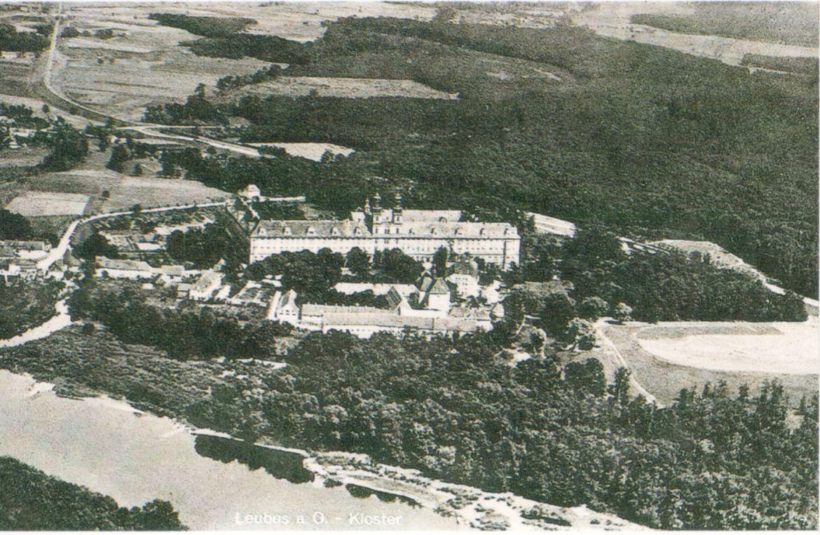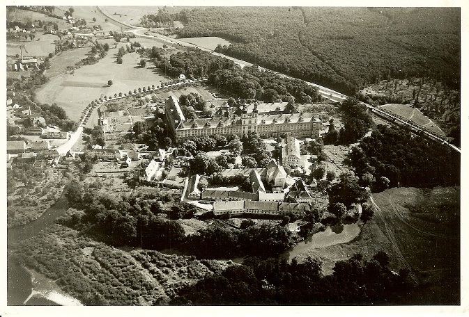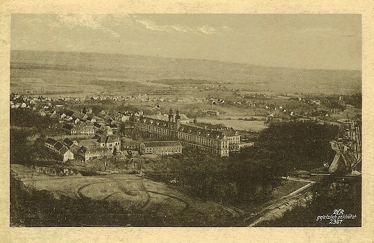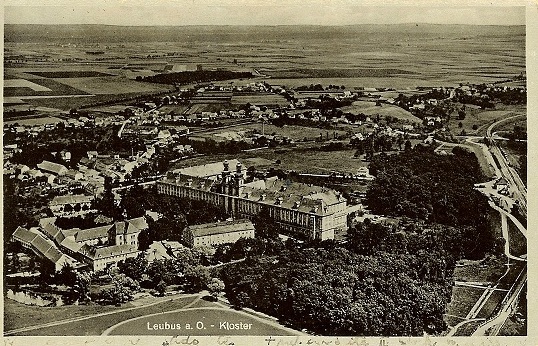 (KP) Widok na klasztor od strony południowo – zachodniej, po prawej widoczna stacja kolejowa, po lewej nieistniejące zabudowania na placu klasztornym – obieg 1942r. Lagerpost